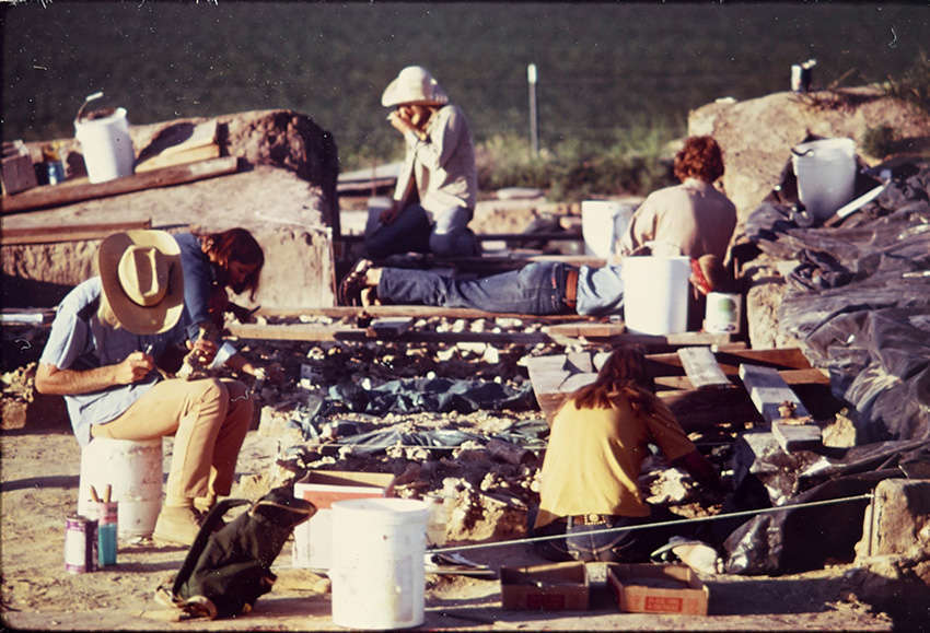Stanford worked for the Smithsonian Institution, and with additional funding through National Geographic, he led excavations and research teams at the site in the summers of 1973, 1974, and 1975. These teams excavated the site in 2 x 2-meter grids, carefully uncovering a bed of Bison antiquus bones, a now extinct ancestor of modern bison. They worked each year to determine the extent of the site, while also investigating the fields near and adjacent to the uncovered bone concentration to determine if there was evidence for camps, hearths, homes, or work areas next to the butchery site.