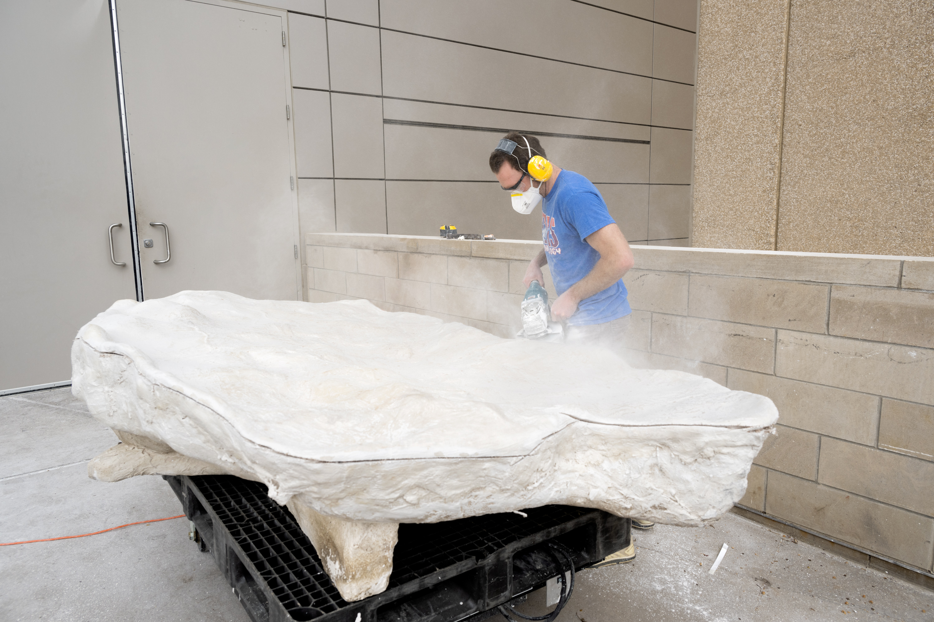 Museum scientist Evan Tamez-Galvan uses a 70-pound jackhammer to remove the overlying rock. (Photo/ Natalie Toth)
