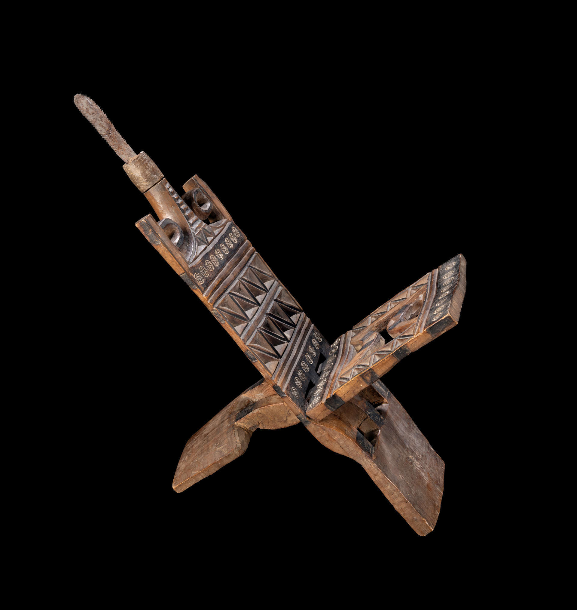 Staff re-discovered an important collection of Kuba masks, including beautiful examples of three royal Kuba masks, known as mwaashmboy , ngaady a mwaash , and bwoom masks. Often interpreted as representing three siblings, these masks tell the Kuba kingdom’s creation in the central Democratic Republic of the Congo, and were usually performed during initiation ceremonies for young men. The mwaashmboy represents the son of the god who came to earth to start the kingdom; the ngaady a mwaash represents his sister (and wife), who is the epitome of femininity and motherhood. The lines curving down from the ngaady a mwaash eyes indicated she is crying tears of joy and pain that symbolize womanhood. Their brother, bwoom, creates conflict by trying to win his sister’s love and overthrow his brother. These three Kuba masks are beautifully decorative, excellent examples of Central African artistry.
