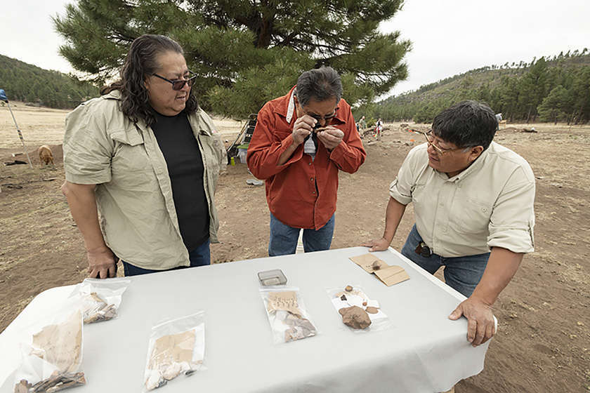 In 2018 and 2019, RAAP turned its attention to the Torriette Lakes Great Kiva. Located at an elevation of 7,300 feet, this is the highest-elevation great kiva in the American Southwest. The site sits adjacent to a Forest Service road, and cattle grazing has recently disturbed the structure. When we first identified this threatened site in 2016, it appeared to be a shallow, isolated, square great kiva of unknown date. Survey, excavation, and remote sensing have refined this interpretation. Thanks in part to this work and collaboration with a team of Zuni cultural advisors, we now hypothesize that the roof for this very large kiva was supported by a series of five huge posts, was built atop earlier structures, and was likely occupied as early as the 12th century. Artifacts at the site consisted of lithics, ground stone, Mogollon plain and painted ceramics, as well as Reserve and Tularosa phase black-on-white pottery, and “thunderstones,” which when rolled across a hard floor surface make a low rumbling sound like that of rolling thunder. Turquoise, crystal, and obsidian also were found as offerings inside of the postholes before construction.